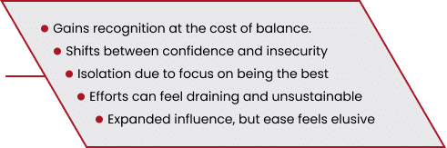 - Feels self-doubt, masks with hard work